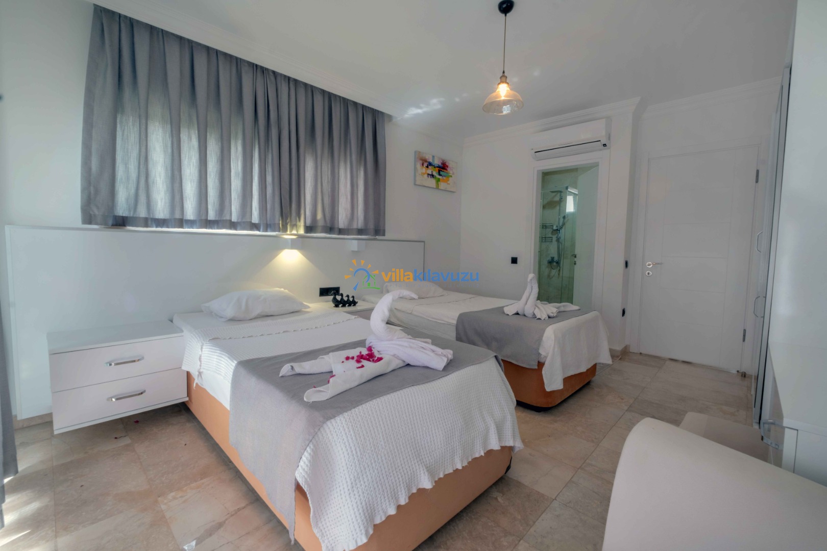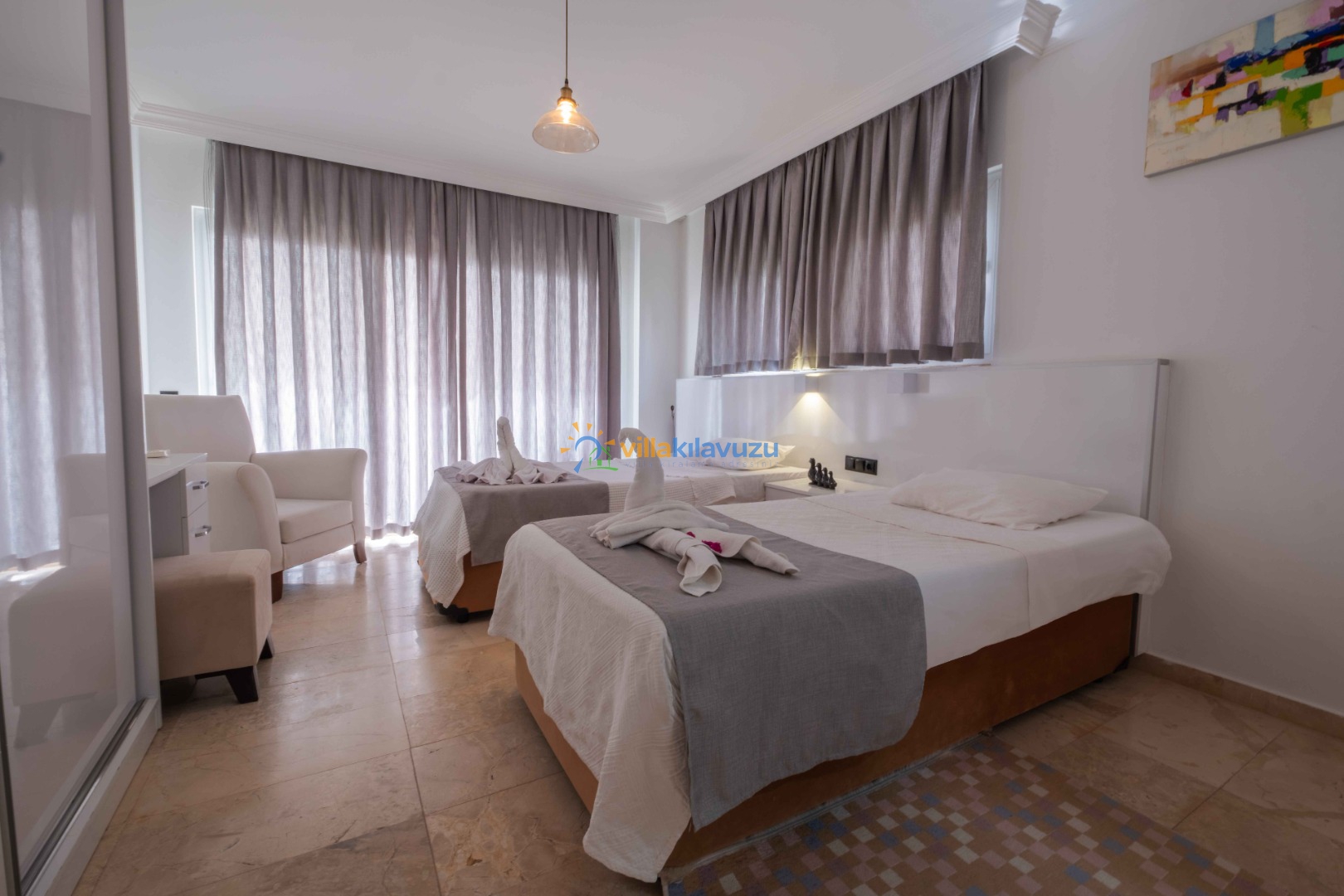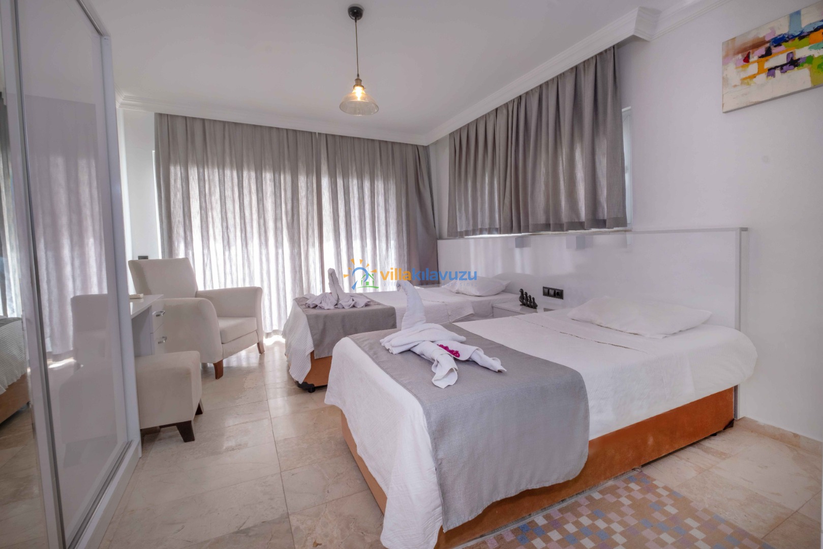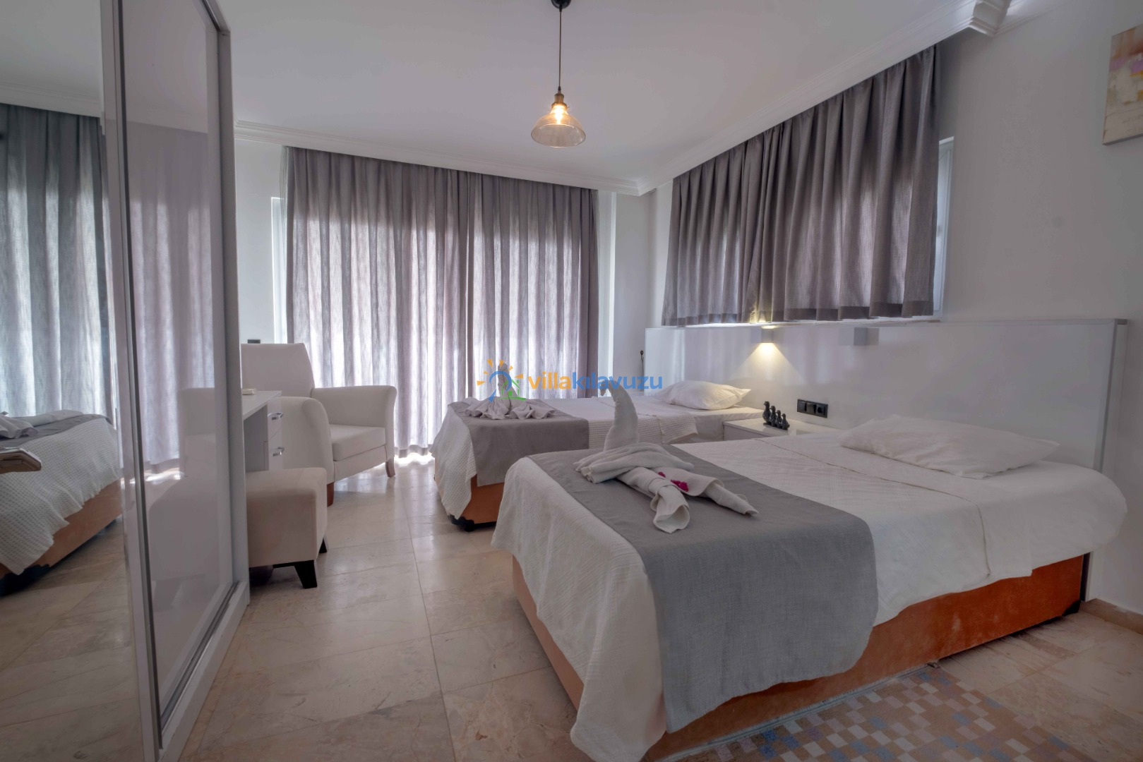 -Villamız 3 yatak odasına sahip olup 6 kişilik konaklama kapasitesine sahiptir.